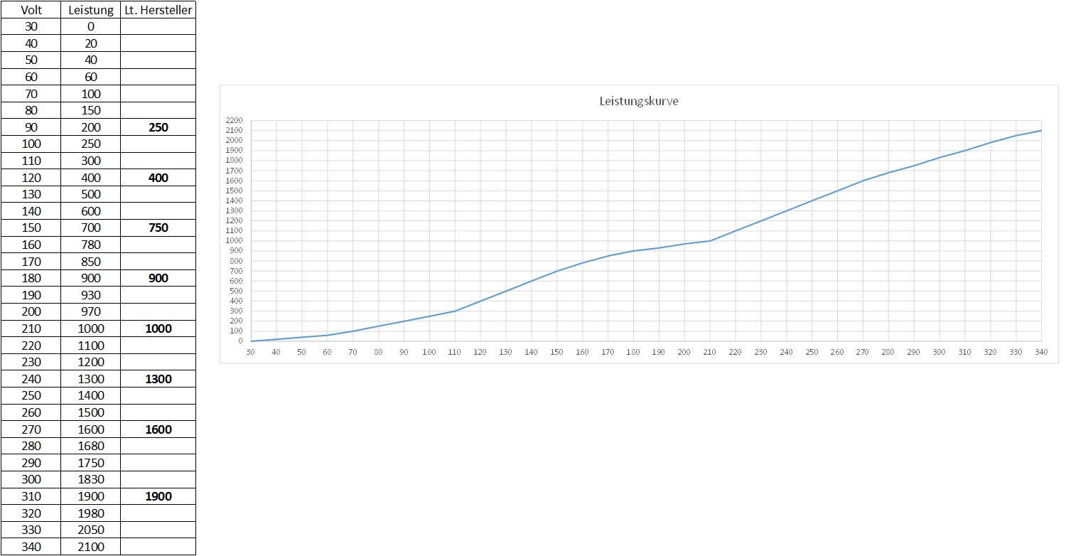 Aber nur 60 Watt bei 90 Volt und 20 Watt bei 60 Volt? Also aktuell läuft die Anlage Super mit 60 Watt bei 60 Volt, wenn das zu hoch wäre dann müsste er doch mit der Drehzahl einbrechen, da eine zu hohe Last, oder? Da die Anlage aktuell auch im Bereich 80/90 Volt recht schnell hochdreht habe ich schon überlegt ob es nicht Sinn macht, doch die Kurve etwas steiler zu machen, um bei 90 Volt schon die 250 Watt zu haben wie im Datenblatt des Herstellers angegeben... (Ich hoffe mal ich rechne korrekt, 65 Volt AC sind dann 90 Volt DC.)