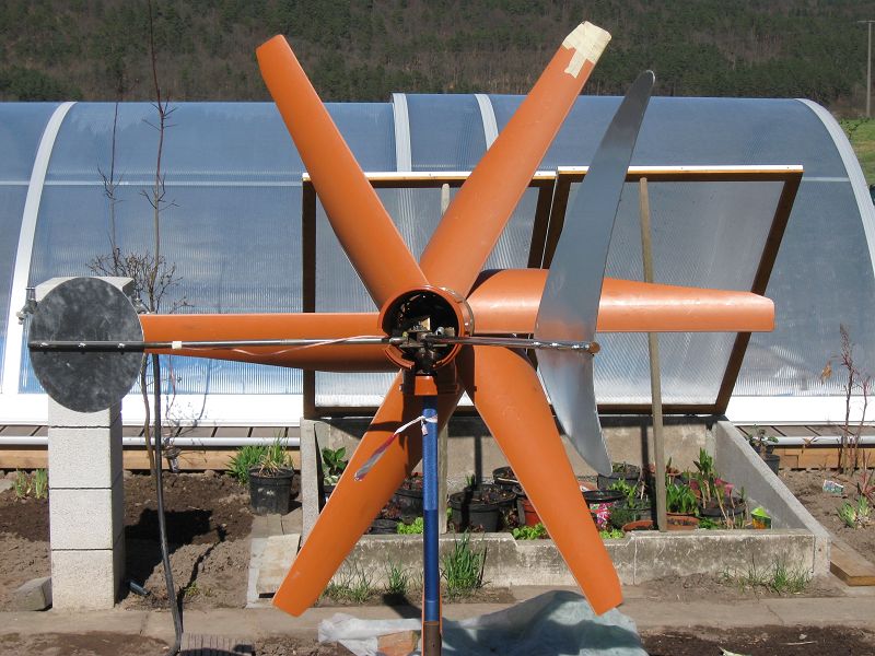 Zum Aufbau: der ist eigentlich simpel, über 2 Kugellager vom Mast zum Gehäuse, vorne am Hehäuse einfach den Nabenmotor angeschraubt. Als Sturmsicherung hab ich mich für die Seitenfahnenregelung entschieden weil einfach zu bauen und leicht einstallbar. Den Aufbau also mal schnell im Kofferraum vom Auto festgespannt und so eingestellt das er sich bei ca 30km/h aus dem Wind dreht. Die Windfahnen sind aus 2mm Alublech. Nabe ist eine gedrehte 10mm Stahlscheibe mit angeschweißten Gewindestück (aus dem Ritzelpaket) das man sie einfach auf den Pedelec-Motor aufschrauben kann, Bohrungen sollten schon einigermaßen passen, hab sie daher aufm Rundtisch gefräst.