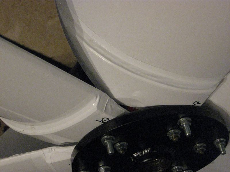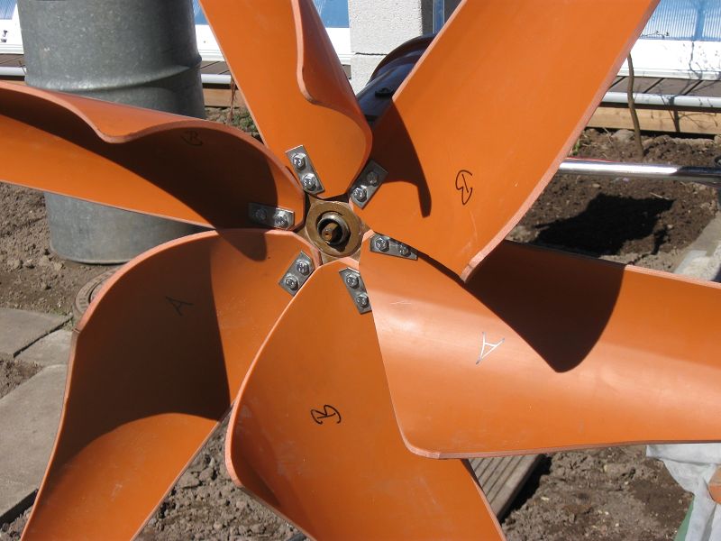 Zu den Flügeln: für ca 1,5m Rotordurchmesser wurden die Windfahnen ausgelegt. RoWiTool, hmm, sieht ja interessant aus, also mal Daten eingegeben und sehen was raus kommt, perfekt. In Baumarkt gerannt, nen meter 250er KG-Rohr geholt (sollte reichen für 6 Blätter á 70cm) und mit der Stichsäge rausgehackt. Und tatsache, nichtmal 5% Verschnitt und die innen abgesägten 3-Ecke konnte man gleich als Verstärung hintendran wieder aufkleben. Fächerscheibe auf die Flex, Kanten geglättet und angefast, die ganze Werkstatt sieht jetzt aus wie Sau, der Staub lädt sich anscheinend statisch auf und bleibt wirklich überall hängen, einschließlich in den Klamotten. Zuletzt noch alle Flügel gewogen da mir ausgefallen ist das die Wandung nicht 100% gleich ist und dann so angeordnet das keine Unwucht entsteht. Ach ja, beklebt hab ich sie noch mit weißer ORACAL Folie aus dem Werbe- und KFZ-Bereich, kann man lassen denk ich.