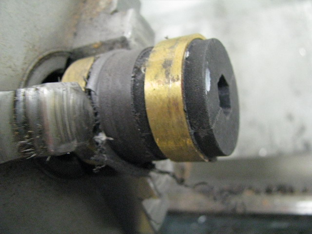 Wie erkennbar, hat es genau in der Mitte der beiden Schleifringe eine weitere nicht belegte Ringaufnahme ab Werk. Diese muss nun etwas abgedreht werden, so dass darauf eine Laufbahn aus Messing oder Kupfer geklebt werden kann.1,5 mm sollten abgedreht werden, breite 10mm. Im gleichen Arbeitsgang wird noch ein 12mm Loch in die Kontakthalterung gebohrt ( von der Seite, wo die 2 Zuleitungen in den Halter führen ), dazu vorher logischerweise die beiden Drähte abschneiden.