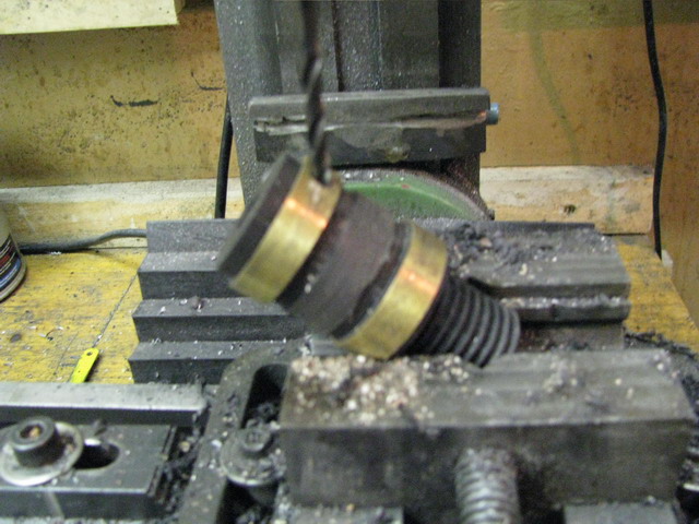 Als nächstes, bohren wir im Versatz von 120 Grad in jeden Sleifring ein Loch von 4 mm und zwar etwa im 45 Grad Winkel zur Achse, somit lassen sich die Zuleitungen leichter einfädeln. Auch muss gleich das gebohrte Loch noch angesenkt werden, damit eine entsprechend grosse Fläche zum Einlöten entsteht.