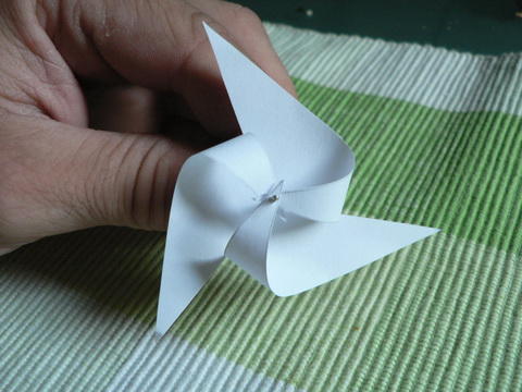 Ein Blatt A4 im quadrad geschnitten. Von den Spitzen an ca. 2/3tel eingeschnitten. 5 Löcher gepickst und alles mit einem Nagel zusammen geführt.