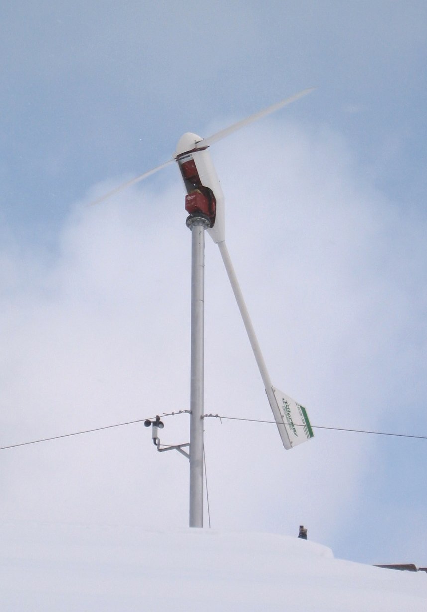 Ein großer Nachteil der Heli-Anlagen zeigt sich aber bei Generator-Kurzschluss, händisch bei Sturm ausgelöst oder vom Einspeise-WR. Es dreht nämlich den Generator entgegen der Drehrichtung des Rotors. Das kann auch die Windfahne nicht verhindern, zumal bei solchen Bauweisen wie bei der Inclin der wirksame Hebelarm arg verkürzt ist. (Bei Antaris, baugleich mit Heyde, da ursprünglich von ihm entwickelt, besser gelöst).