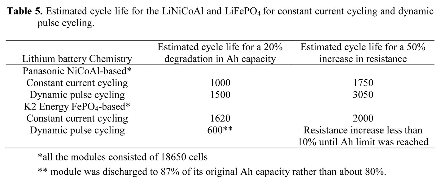 Table 5.Estimated cycle life for the LiNiCoAl and LiFePO4 for constant current cycling and dynamic pulse cycling.Lithium battery ChemistryEstimated cycle life for a 20% degradation in Ah capacityEstimated cycle life for a 50% increase in resistancePanasonic NiCoAl-based*Constant current cycling10001750Dynamic pulse cycling15003050K2 Energy FePO4-based*Constant current cycling16202000Dynamic pulse cycling600**Resistance increase less than 10% until Ah limit was reached