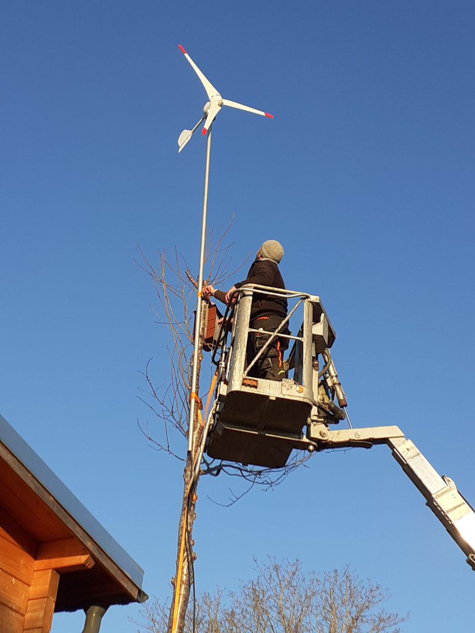 Eigentlich war der nackte Stamm einer kranken wilden Kirsche auch Anstoß, dass ich dort oben jetzt ein Windrad montiere, damit der Stamm noch für mehr gut ist als nur für ein Starenhaus, die dort oben übrigens seit Jahren fleissig jedes Jahr zweimal brüten! Hoffentlich stört sie das Windrad jetzt nicht. Hab extra die Flügelspitzen rot lackiert, damit sie besser aufpassen!
