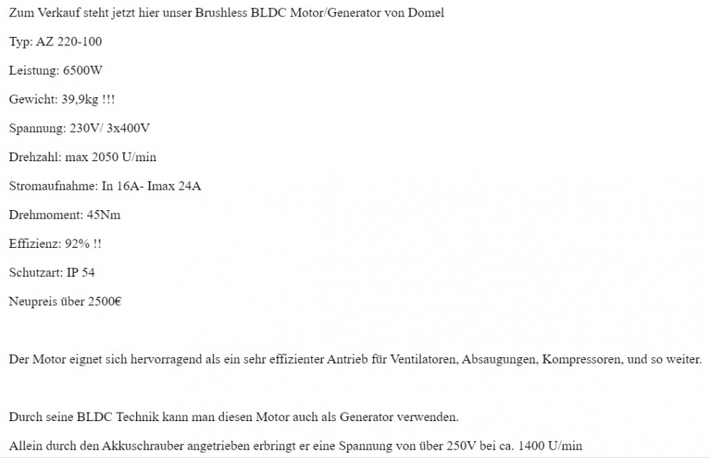 Da sich der PV-Speicher auch für den Eigenverbrauch der 14 kW PV-Anlage rechnen würde, käme der Motor + Frequenzumrichter gebraucht mit 250€ hin. Allerdings 10% Weniger Wirkungsgrad des Asynchron plus die Verluste des Fequenzumrichter.