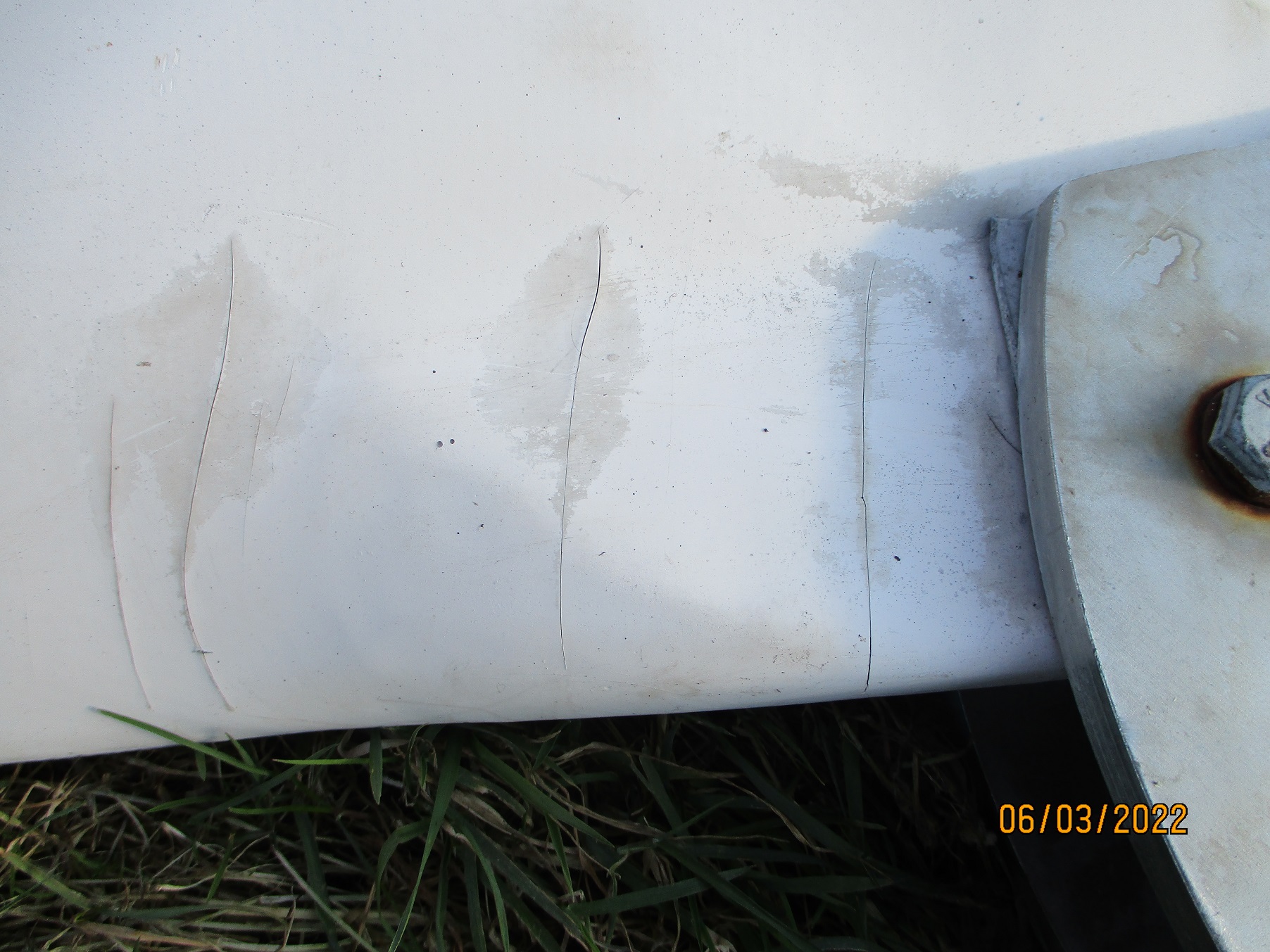 abschleifen, evt. Risse mit Epoxid und Gewebe ausbessern und mit Epoxid Grund und Farbe neu lackieren