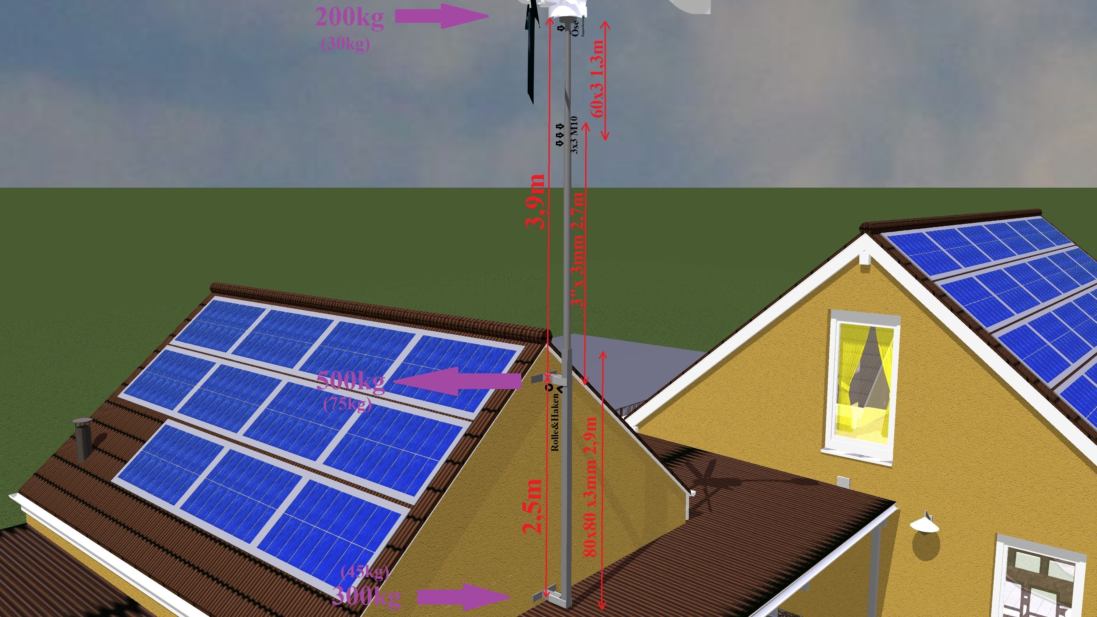 Die 30kg in Klammern sind das Windrad mit Generatorgewicht und waren nur als eine Art Normalbelastung gedacht. Wenn quasi der Wind 30kg so etwas hin und her schaukelt.