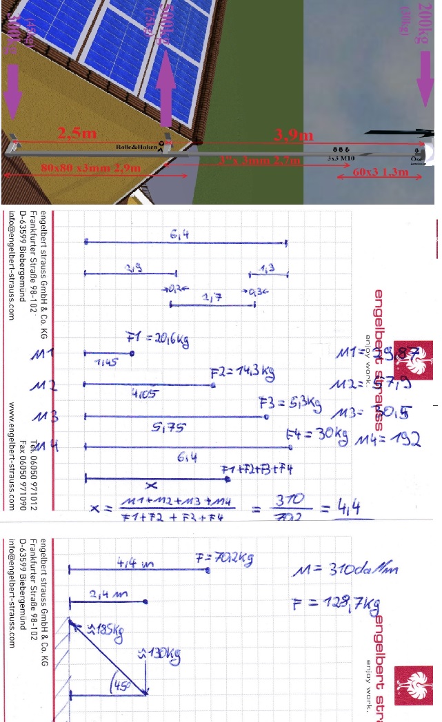 Die Rohre stecken 0,2m und 0,3m ineinander. Mastlänge am Ende dadurch 6,4m. Ich habe von jedem Teil die Schwerpunkte mit der Entfernung zum Lager genommen und daraus die Drehmomente errechnet. Am Ende alle Drehmomente addiert und durch das Gesamtgewicht geteilt. So dass ich auf die Entfernung des eigentlichen Schwerpunktes aller 4 Elemente kam. Dieser Punkt ist bei 4,4m und hat 70,2kg (Pfosten+Generatorgesamtgewicht).