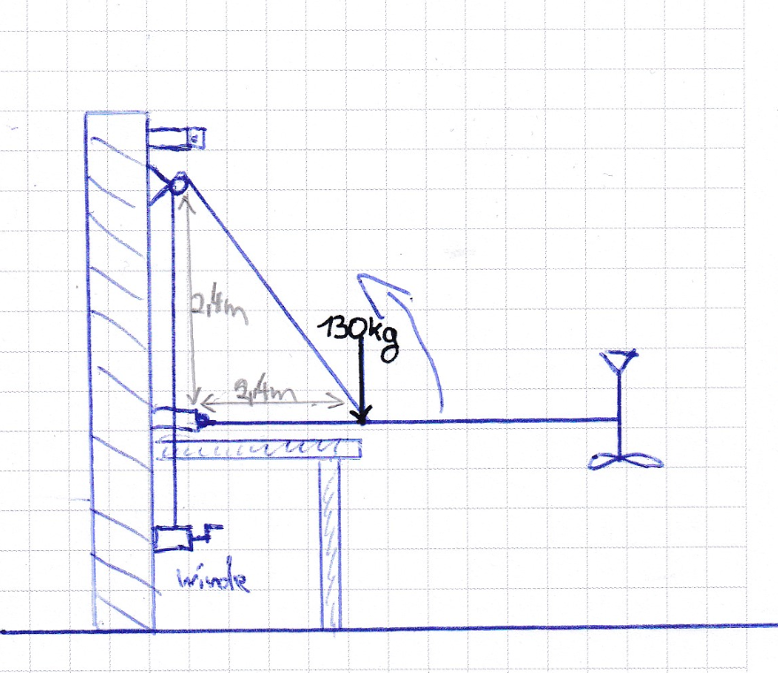 Kabel leg ich im Winter auch nicht im Außenbereich, aber alles innerhalb sind schöne Winteraufgaben. In meinen nicht beheizten Garagen war das im Winter trotz Heizlüfter bei 5x6² für die WBen damals schon spannend. 5x10² für die UVs sind auch immer spannend. Da war das Umklemmen mit flexiblen Leitungen im Hausanschluss auf 5x16² schöner... Wie gesagt, da kommt nochmal richtig viel Arbeit auf mich zu, komplett Notstrom + Überspannungsableitung wird es dann werden. Vorerst muss aber mein neues Projekt, das Windrad erstmal stehen. Nächster Schritt dabei: Seilzug zum Aufstellen. Kommen meine Kräfte hin, was sagst du? Hab es nochmal verständlicher aufgemalt, was der Seilzug eigentlich macht.
