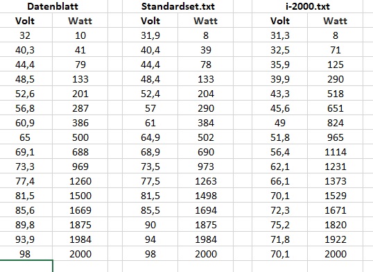 @Che ich hab das falsche Dataset hoch geladen, das war das Standard, du hast recht. Aber dank dir sehe ich jetzt, wo ich suchen muss. War bei den Dateien etwas verwirrt, da mir Solarinvert die Daten geschrieben hatte 1x als Dataset und 1x das Original. Mit Original meinen die die i-2000 Kennlinie, also so wie ich bestellt hab und mit Dataset das Serienset. *rolleye*
