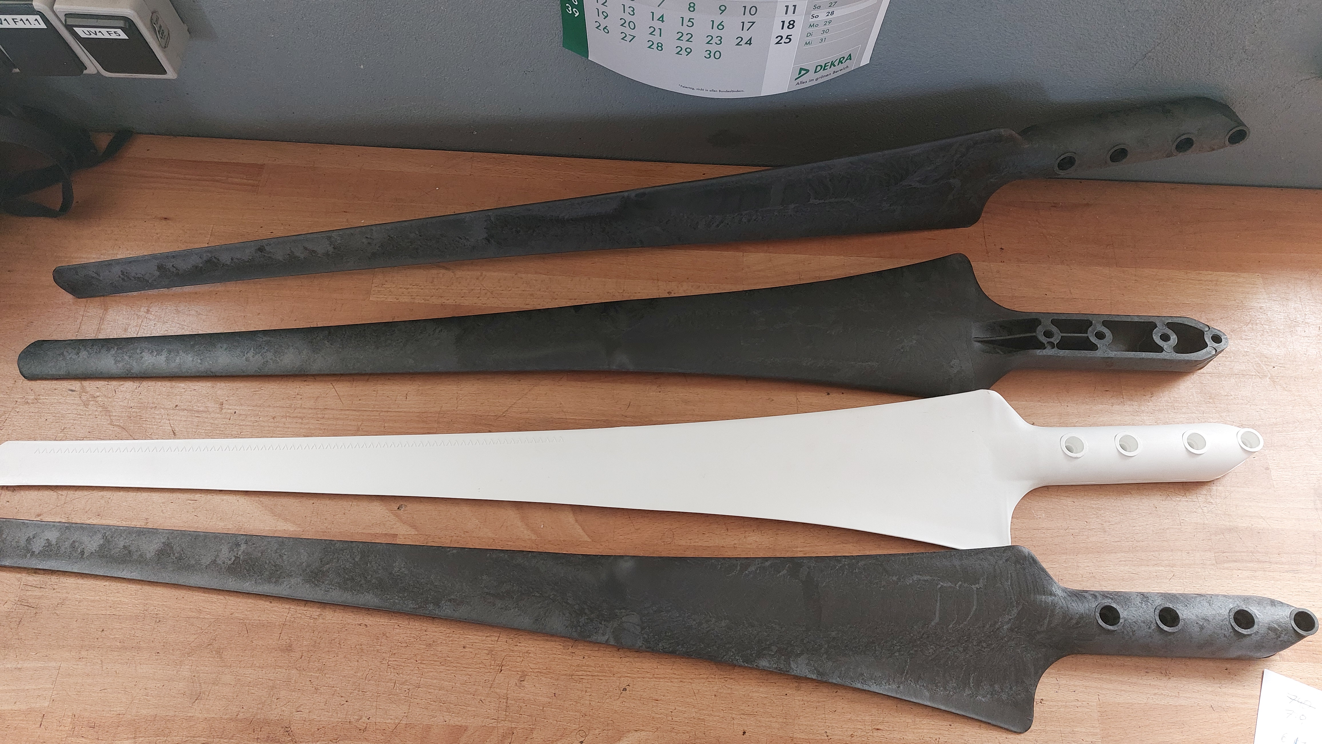 Und die sind ja mal richtig stabil im Vergleich zu den Standardblättern. Es ist nicht nur die Farbe! Wärend ich mit leichter Kraft die Standardteile am Ende 10cm biegen kann, sind das bei den Karbon nur 2cm. Man merkt direkt, dass die viel steifer sind. Schwerer sind sie aber auch. Alle drei wiegen je 738g. Keine Abweichungen untereinander. Die Standard hatten 657g. Was am Karbon allerdings fehlt sind die kleinen Dreiecke für den leiseren Strömungseintritt, an der Flügel Innenkante. Siehe Bilder.