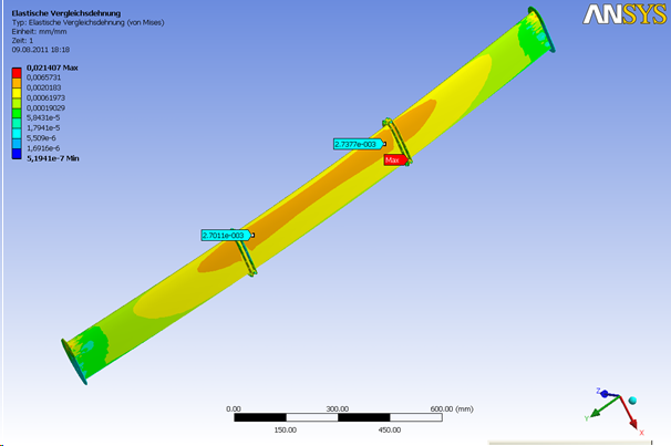 Im Anhang als Anhaltspunkt die Bereiche höchster Dehnung, also auch höchter Belastung, bei Einspannung nicht an den Enden, Empfehlung.