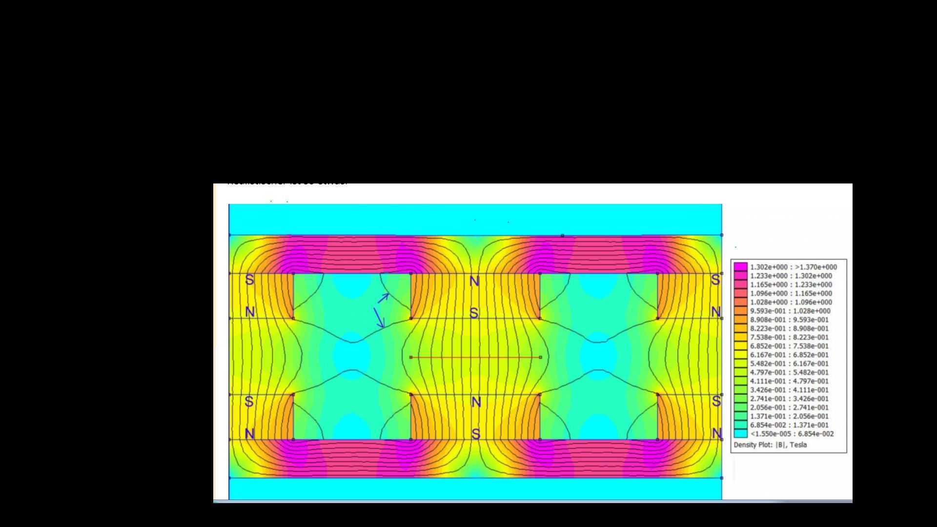Die Magnete können bei magnetischem Kurzschluß mit Eisen etwa 1,4 Teslar durchleiten , im großen Luftspallt, der einen großen Wiederstand hat kommen nur die hälfte davon zum Einsatz und die Magnetspulen reduzieren das auch noch weiter durch Ihr Gegenfeld.