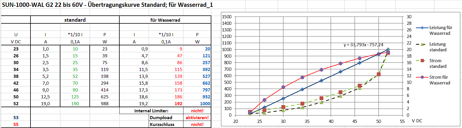 Die Übertragungskurve (-Linie) vom WR steht bei 52V DC aber derzeit bei 1200W.