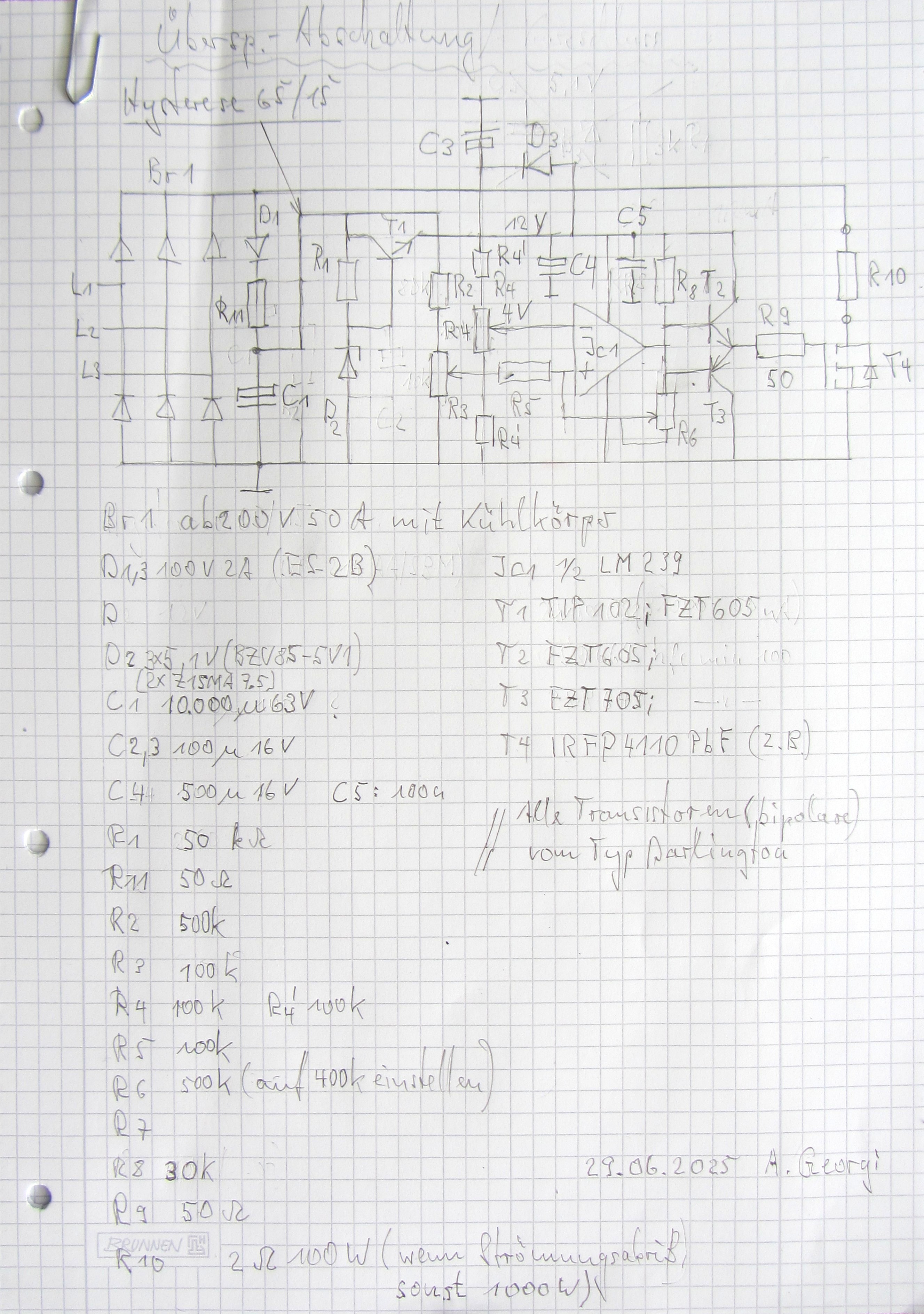 Daher im Anhang als Vorschlag eine Schaltung, zunächst noch nicht mit Generatorkurzschluss, sondern ab z.B. 65V (Bei genanntem SUN-WAL besser 60V) Zuschaltung einer weiteren Ersatzlast auf der Gleichstromseite.