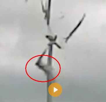 Das sieht mir sehr nach ner konztrollierten Sprengung aus. Eingeleitet durch eine Explosion rechts am Mastfuß. Sieht man ganz am Anfang. Dann noch eine mitten im Mast und die Blätter wurden wohl auch abgesprengt.