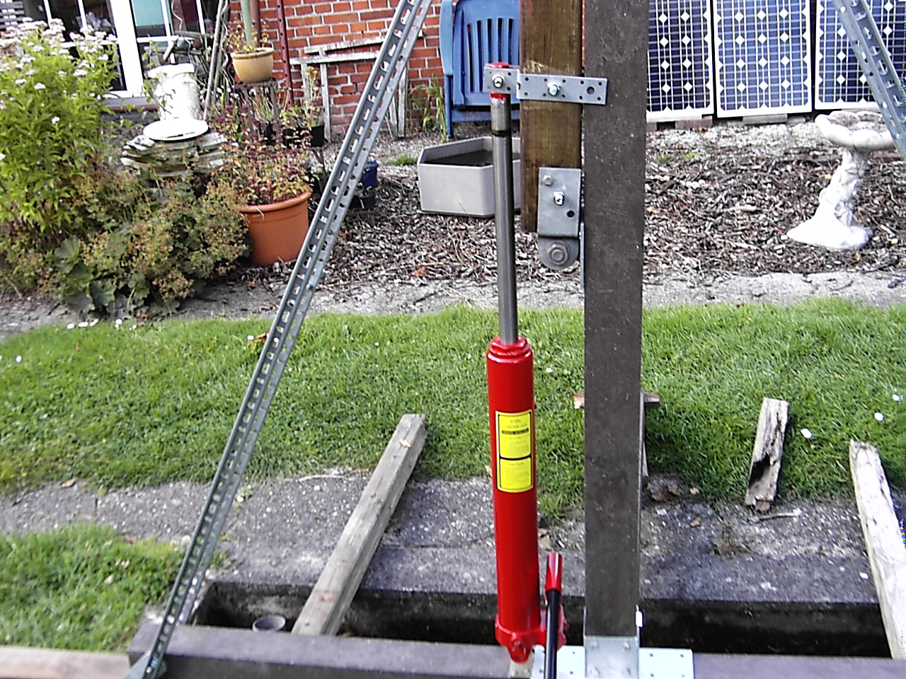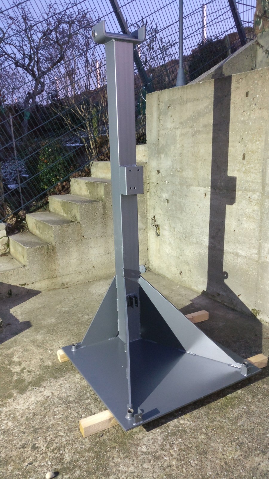 Wichtig ist, dass die Befestigungen für die Abspannung links und rechts die gleiche höhe haben wie der Drehpunkt des Mast-Fußes beim Aufrichten, denn sonst hat man mit der Abspannung Probleme, denn wenn die Abapannnungs-Befestigung tiefer liegt dann spannen sich die Seile beim hochziehen. Sind diese dagegen etwas höher werden die Seile beim hochziehen lockerer.