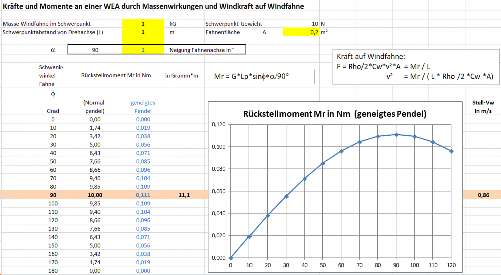 Es brauchte also lediglich 11,1 Gramm auf die Windfahne, um sie bei diesen Vorgaben wieder in den Wind zu drehen.