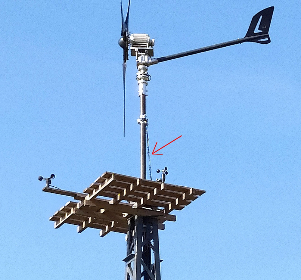 Selbst bei 3 Kg Massenunterschied am Schwerpunkt der Windfahne oder bei 3° Mastabweichung von der Senkrechten wäre es lediglich 1,49 m/s. Immer noch akzeptabel, wenn das Windrad erst bei 2 m/s anläuft, was mehr als genügt.