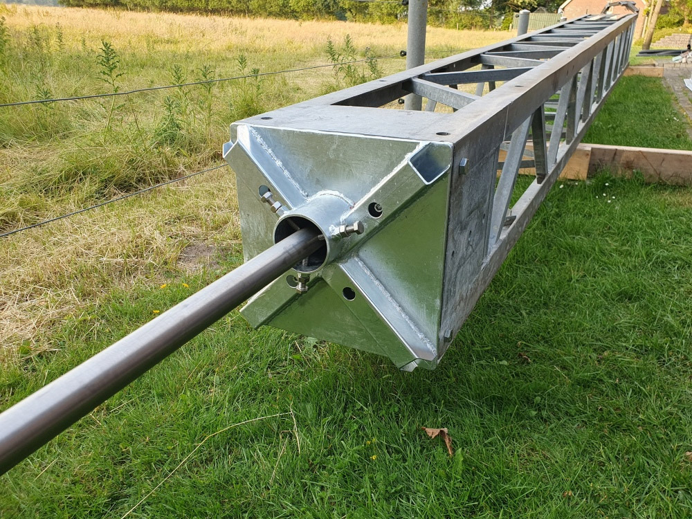 In den Mastkopf ist ein 100mm Rohr eingeschweißt, ca. 50 cm lang - das obere Ende davon siehst du auf dem Foto. Das Standrohr der Windkraftanlage kann man, wenn man es gelöst hat, absenken. Als ich den Mast aufgerichtet habe, war das Standrohr abgesenkt. Ich bin dann später raufgeklettert und habe das Standrohr hochgezogen. Damit man das Standrohr direkt beim hochziehen arretieren kann, gibt es unten an dem 100mm Rohr im Mastkopf einen Bajonettverschluss in den das Standrohr einrastet. Um das 100m Rohr auf das Standrohr der Windkraftanlage zu adaptieren, gibt es eine entsprechend lange Reduzierhülse. Die ist auf dem Foto noch nicht zu sehen, weil ich diese zu dem Zeitpunkt, als das Foto entstand, noch nicht angefertigt hatte. Zusätzlich zum Bajonettverschluss wird das Standrohr dann noch an zwei Stellen mit jeweils drei um 120° versetzten Schrauben geklemmt. Die eine Stelle siehst du auf dem Foto, die zweite Stelle ist unterhalb des Mastkopfes. Die Schrauben halten außerdem noch die Reduzierhülse in dem 100m Rohr fest. Die Reduzierhülse hat an den Positionen der Schrauben entsprechende Löcher, sodass die Schrauben durch die Reduzierhülse hindurch das Standrohr klemmen können.