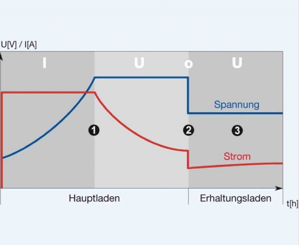 Auch kann man die Absorptionsladung erkennen: langsam sinkender Strom und natürlich das Ladeende: es fließt kaum noch Strom. Mit Hilfe einer Belastungsmessung (Siehe Spannung) kann man den