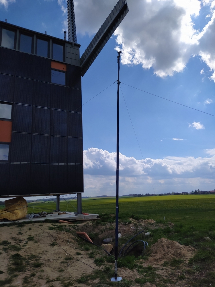 Auf einem alten teilbaren Surfmast, ca. 5,5 m hoch. Abstand zur Rotorachse ca. 20m. Das sollte bei Blattlänge 7,5m genügen.