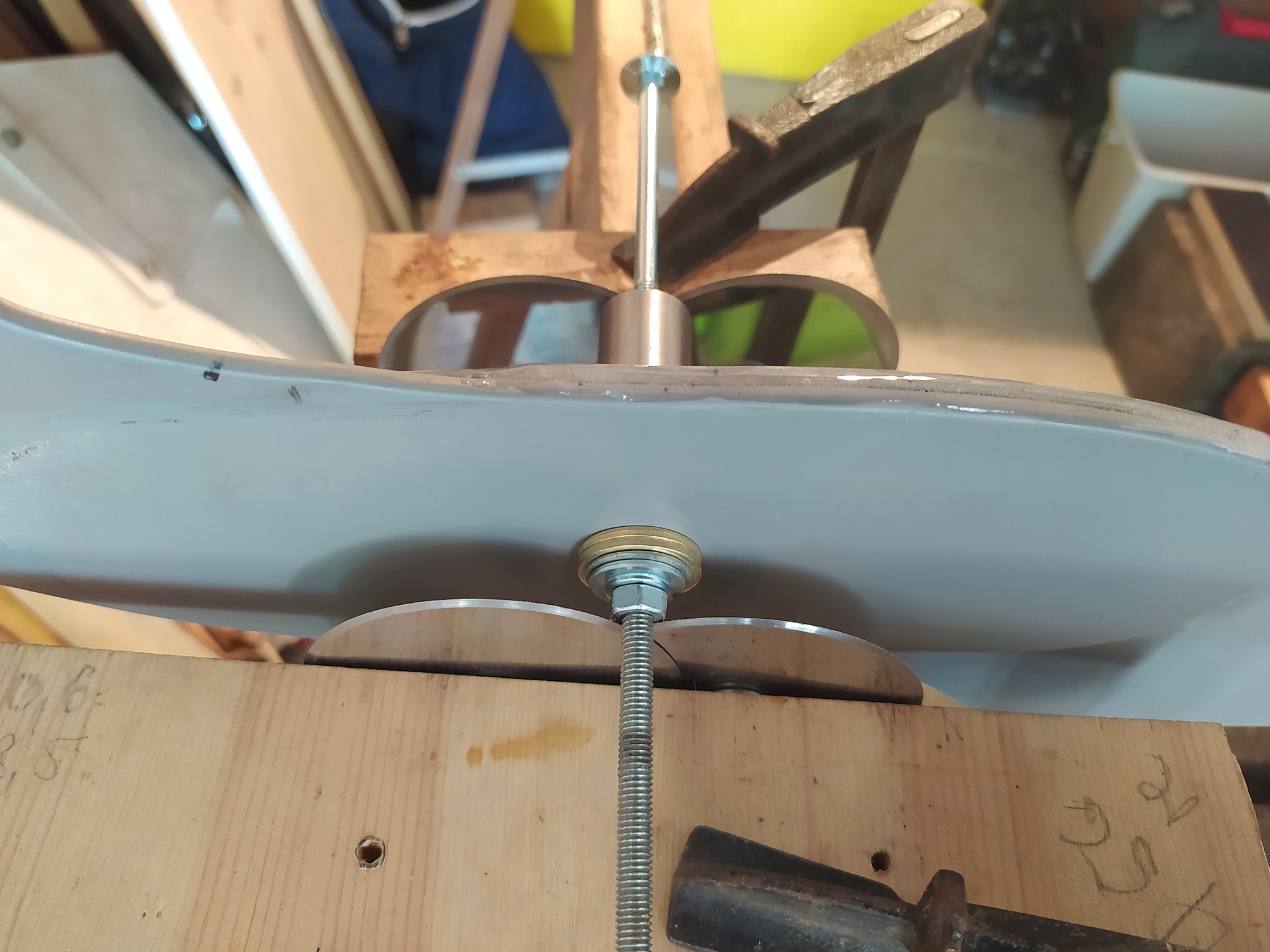 In der Mitte eine Zentrierwelle, auf einer Auswuchteinrichtung aufgelegt. Bestehend aus 4 Rundscheiben, hier gewonnen aus 4 Pizzaschneidern. Da angeschliffen, graben sie sich sogar in die Gewindegänge.