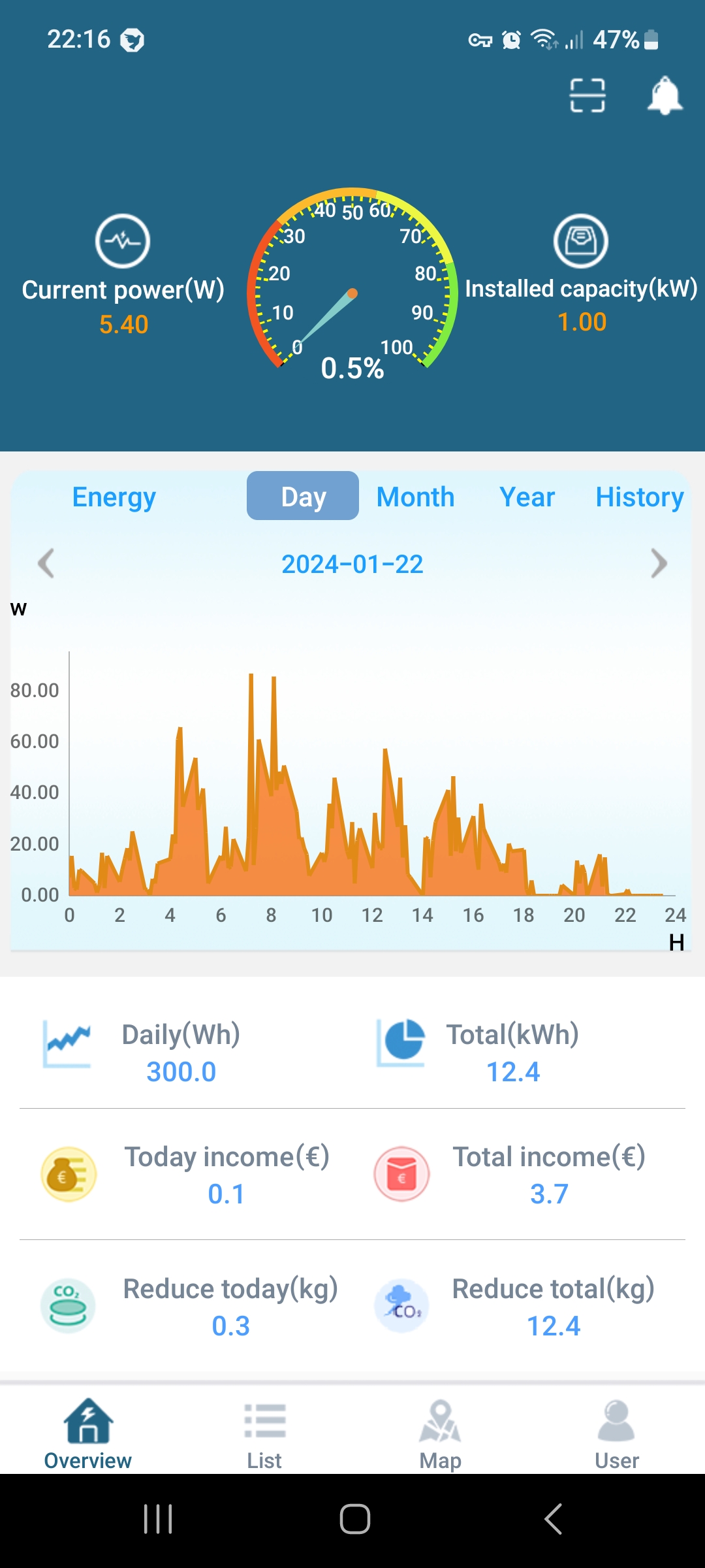 Tagesertrag (mit viel Wind oberhalb meines Standortes) sieht dann immer so aus. Von heute, ist aber übertragbar auf alle "windige" ä böige Tage bei mir. Leider staut sich der Wind oft und jede Böe mit paar hundert Watt wird gleich wieder verwirbelt.