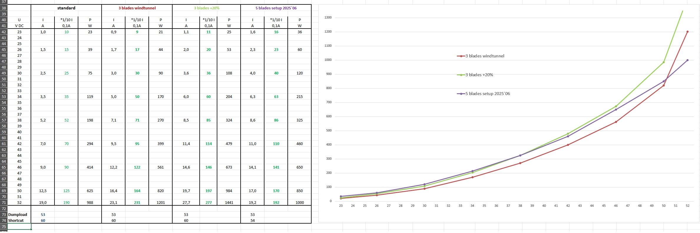 Danke, das ist eine hilfreiche Kennlinie! Ich fasse sie kurz in einer Tabelle zusammen, dann berechne ich eine geschätzte neue V/I-Kennlinie für dein 5-Blatt-Windrad mit +6° Anstellwinkel...
