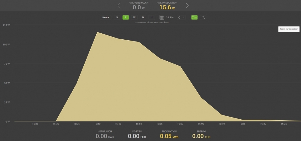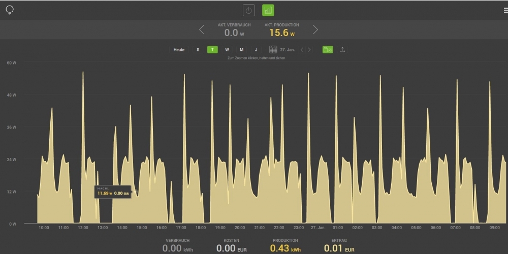 Pro Tag werden auf diese Weise ca. 200 bis 400 Wh ins Netz abgegeben.