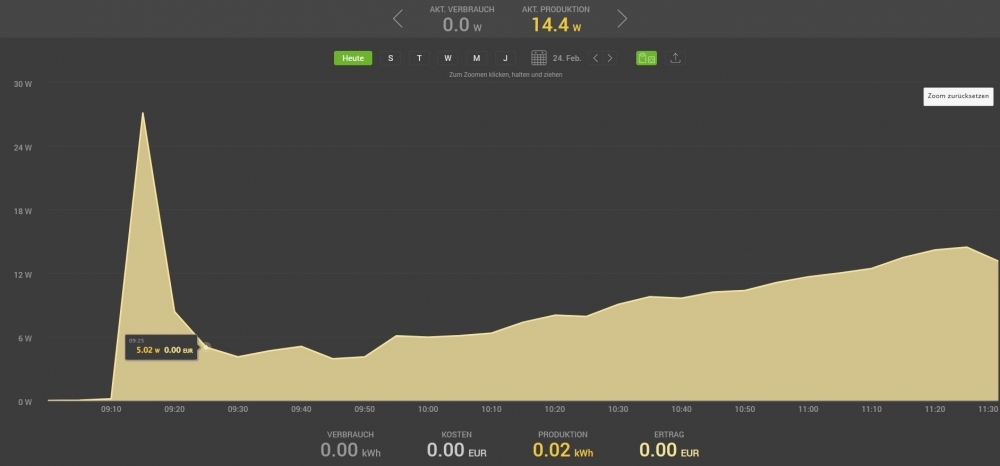 Da ich als zusätzliche Stromversorgung nun eine kleine (0,6*0,6 Meter) 18V PV-Panele drangehängt habe (die ich dann wenn es wärmer wird an den hohen Mast befestigen werde), liefert der Laderregler genügend Energie. Lädt also zuerst die Batterie auf und gibt dann Leistung ab ca. 9:30 ab. Also zuerst 27,1 Watt (nach dem Wechselrichter) dann stark sinkend auf 4,11 Watt und dann mit zunehmender Sonneneinstrahlung (auch wenn kein Wind bläst) steigend auf 13,27 Watt (derzeit sogar 16 Watt).