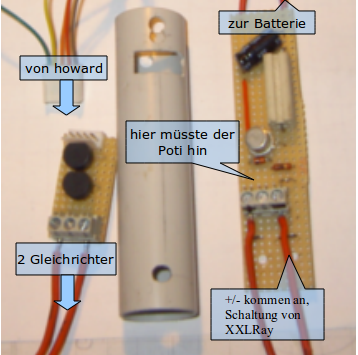 XXL-Ray´s Anregung bezüglich eines Reglers zur Eingangsspannung ist auch schon eingeflossen: es ist ein Poti vor der Diode. Kann das imho nur leider nicht justieren mangels regelbarem Netzteil.