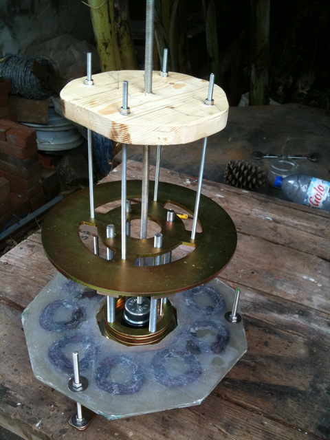 Der Statorhalter hat 6 Arme mit Bohrungen für M16 Gewindestange. Diese habe ciha uf 150mm Länge abgesägt und befestigt, sowie dann den Stator aufgesetzt nachdem die untere Magnetscheibe positioniert war. Auch die MAgnetscheiben werden mit M16 Gewindestangen gehalten, 5 an der Zahl. Dafür genügt die verzinkte Asführung. Die Stangen, Muttern und Scheiben für die Statorbefestigung müssen allerdings aus Edelstah sein damit es kein Cogging gibt wenn die Magnete daran vorbeihuschen.
