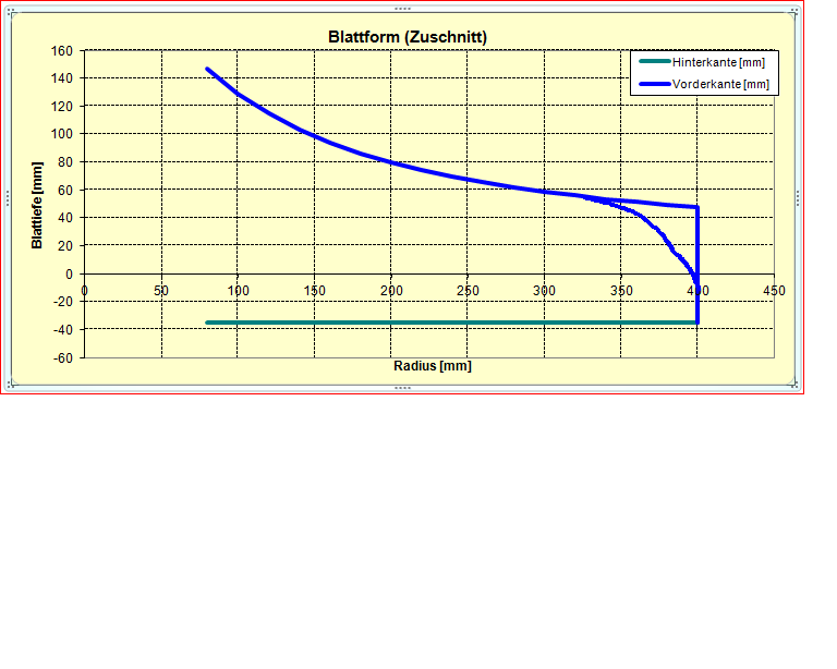 Nachprofilierungen der Blätter, vielleicht an Blattspitzen, nicht notwendig, da satter Leistungsüberschuss. Einlaufkante (Vorderkante) kann man aber runden.