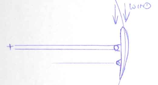 Wenn ich den Augenblick nehme, in dem die Windrichtung genau senkrecht auf den Radius des zu betrachtenden Flügels steht, so würde ich vom Gefühl her sagen, dass dieser Flügel durch den Exzenter genau so eingestellt werden muss, dass er leichten Auftrieb hat, aber der Anstellwinkel in der weiteren Drehbewegung noch vergrößert werden muss.