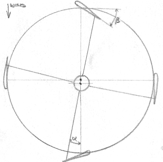 Es erscheint mir mittlerweile am logischsten, dass die Flügel gegen den Wind (in der Abbildung unten also auf 3 Uhr) in Neutralstellung, sprich bei symmetrischem Profil in 90° zum Radius stehen, zur 12 Uhr Position ihren maximal positiven Anstellwinkel erreichen, bei 9 Uhr wieder über die 90° zurückdrehen und bei 6 Uhr maximal negativen Anstellwinkel haben.