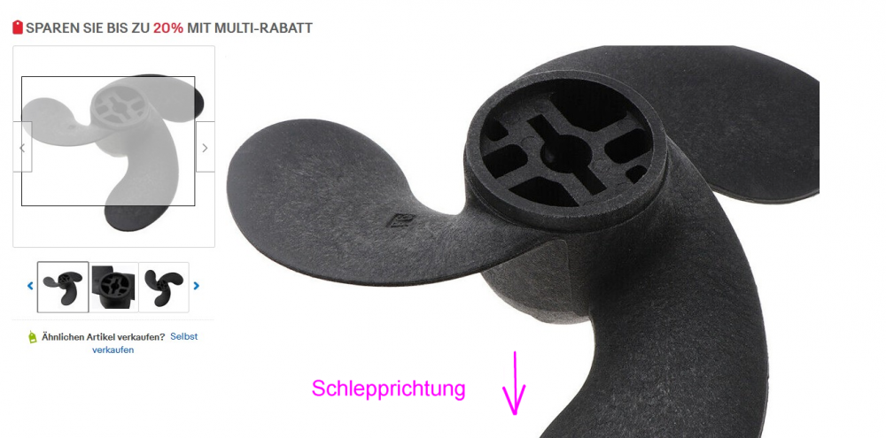 Dennoch, wenn selbst bei kleinen Sportboot-Propellern die Profile heute noch ähnlich sind, so erscheint ein Versuch sinnvoll, sie im Umkehrschlepp zu nutzen. Schlepprichtung eingezeichnet in folgendem Bild.