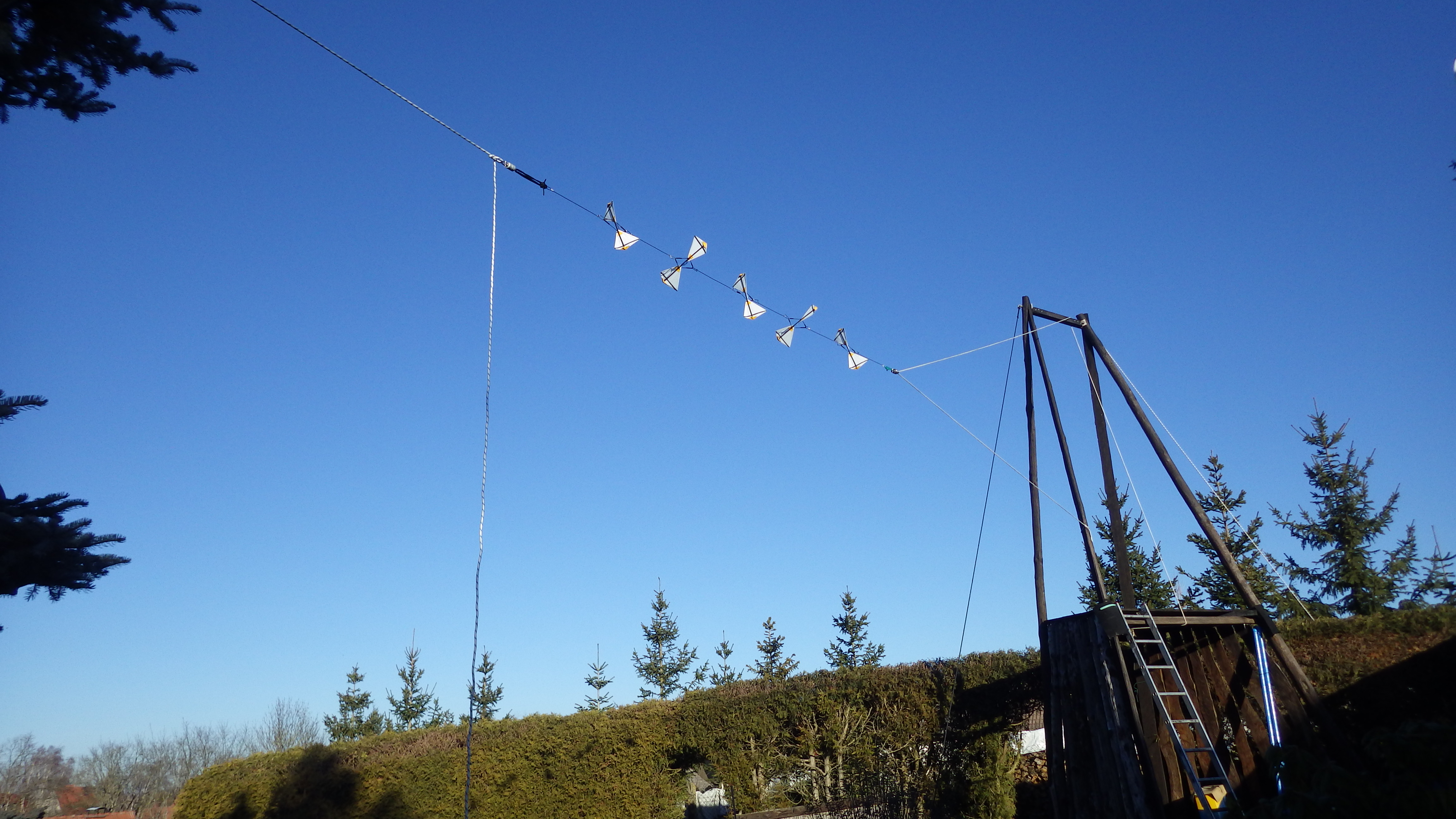 Die Neugierde ist manchmal größer als die Geduld und da inzwischen 5 Segelrotoren fertig sind und draußen die Sonne schien musste ich doch die 5 er Kette schnell mal hochziehen und sehen, ob die Segel auch halten was ich mir davon verspreche. Noch ohne Generator aber schon mit Lagern, an jedem Ende eines, wurde das dann zwischen einer Tanne über die ein Maststummel mit einem Windrad von Wolfgang Schwarz hinausragt und meinem zukünftigen Vertikalrotorteststand - einem Holzgerüst - hochgezogen.