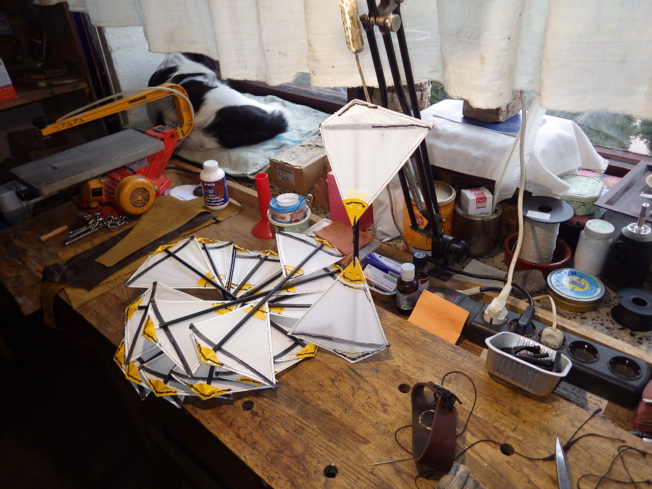 So, die restlichen 10 Segelrotoren sind jetzt fertig aufgespannt und müssen nur noch ihre Konnektionsösen für die Montage in Reihe bekommen. Dann kommt die Segelrotorkette mit ihren 15 Rotoren und VA Drahtverbindern erstmal in die Aufbewahrungskiste. Kugelgelagerte Wabel sind auch schon besorgt.