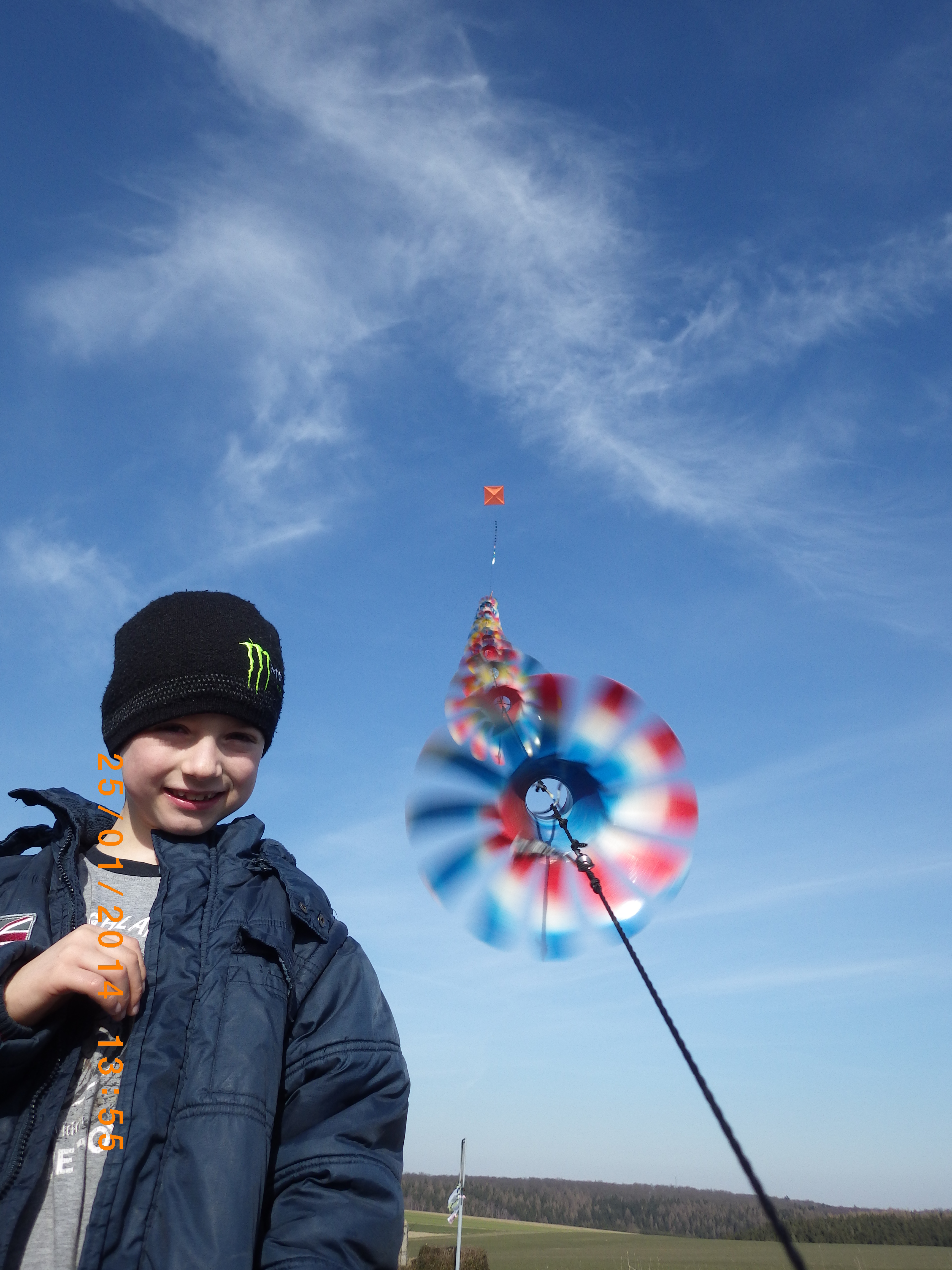 Der Drachen den Du auf meinem Foto (orangener kleiner viereckiger Fleck ohne Schwanz) am Himmel siehst hat Seitenlängen von 1,5m x 1,5m ! Die Windgeschwindigkeit am Boden war 3-4 m/sec.