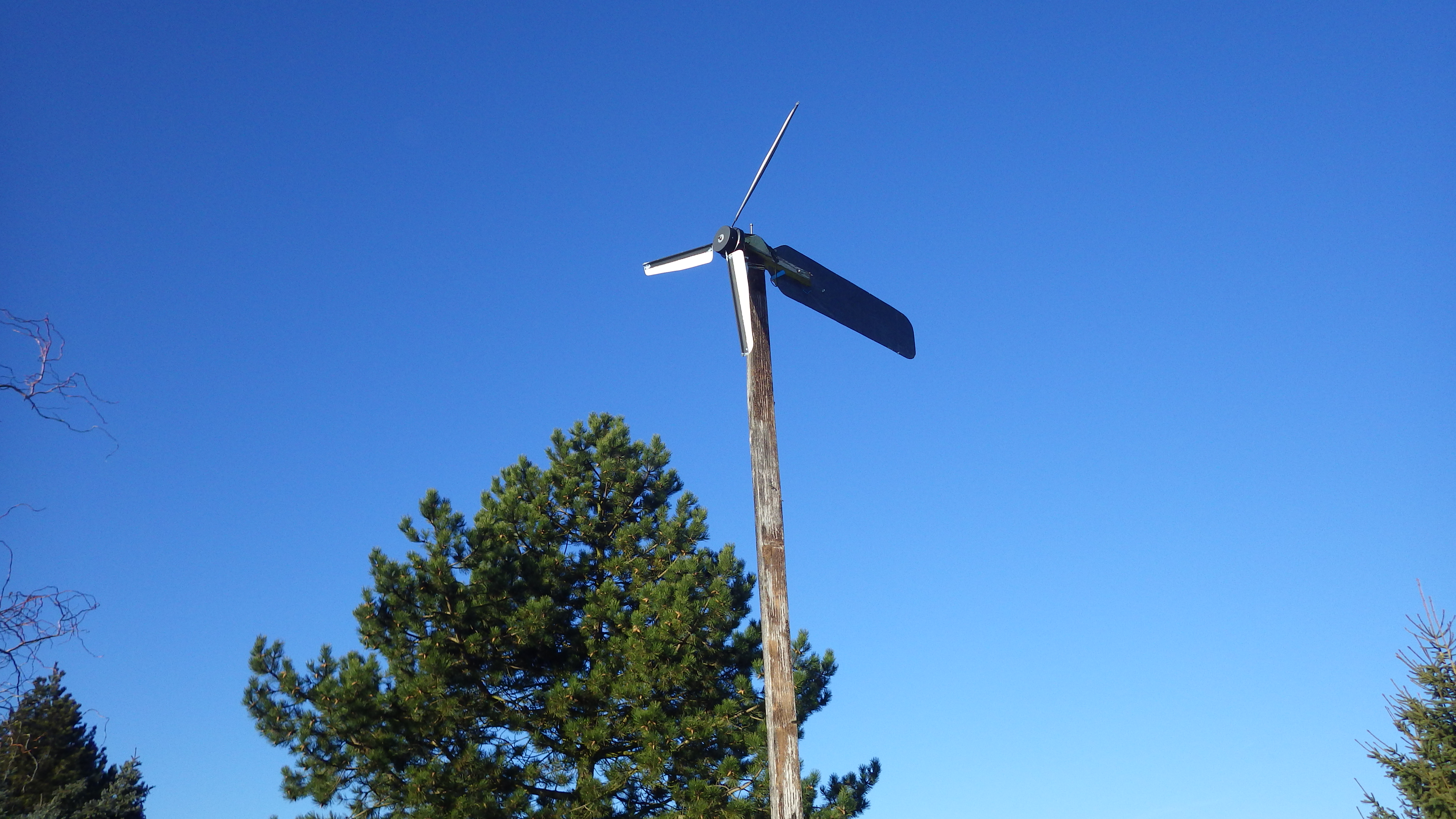 Das ist das Windrad von Illias mit Leichtbau Repeller, wiegt nur wenig mehr als Vogelfedern und ist durch Carbon Alu Verbund stabil genug um bei der Repellergröße von 50 cm D auch Orkanwindstärken ohne Sturmsicherung wegzustecken.