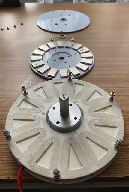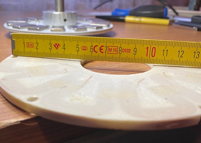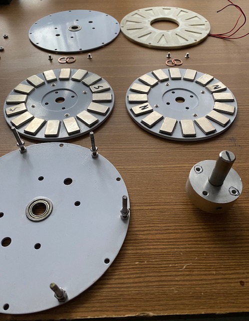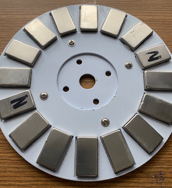 die Magnetscheiben sind 2 Scheiben aus 2mm Material auf der einen sitzen die 16 Magnete die andere halten die Magnete, Magnete sind angeleimt, beide Metallscheiben sind mit 4 Schrauben zusammen geschraubt, Magnete haben eine Größe von 24x14x4 mm.