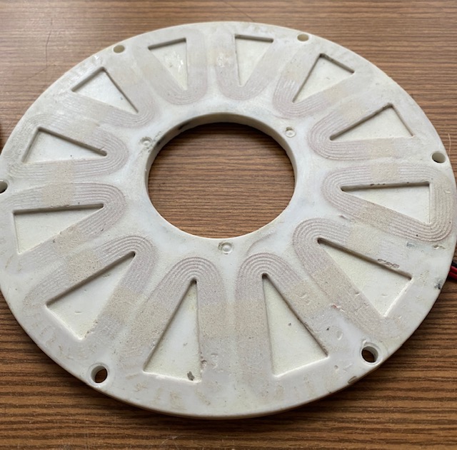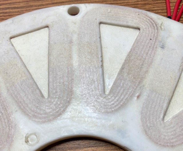 die Spulenscheibe hat 12 Spulen mit etwa 1 mm Draht und 7 Lagen nach der Dicke der Scheibe zu urteilen (5 mm) könnten auf einer Spule 35 Windungen drauf sein zwischen den 3 Anschlussdrähten ist ein Widerstand von 4,2 Ohm.