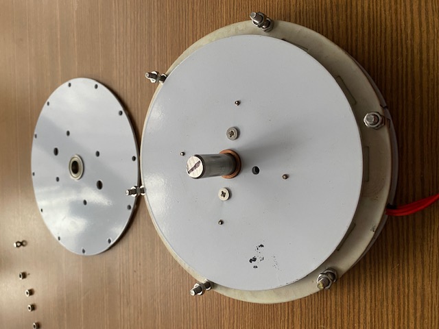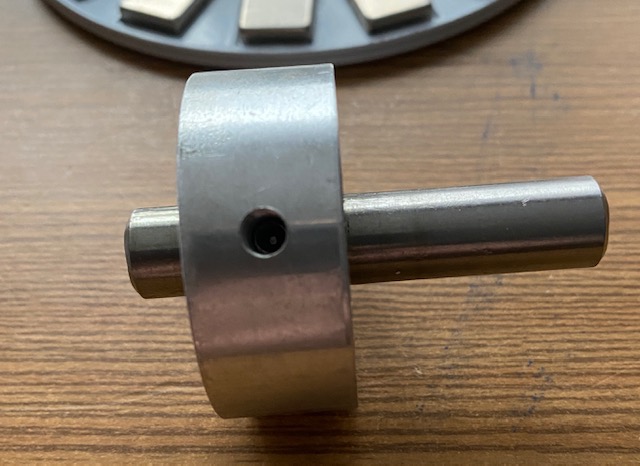 das ist die Gerneratorwelle, Durchmesser 12 mm, mit der Halterung auf die die beiden Magnetscheiben mit 2 Schrauben rechts und links draufgeschraubt werden.