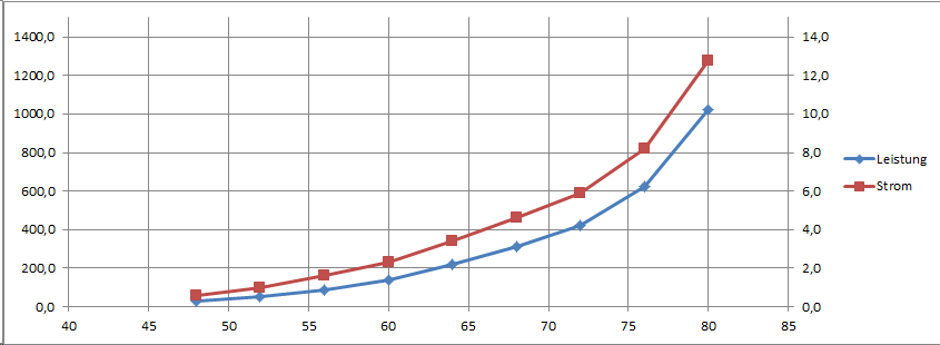Diese Kurve muss zunächst in den Leistungen und Stromstärken um den Faktor 10 vermindert werden.