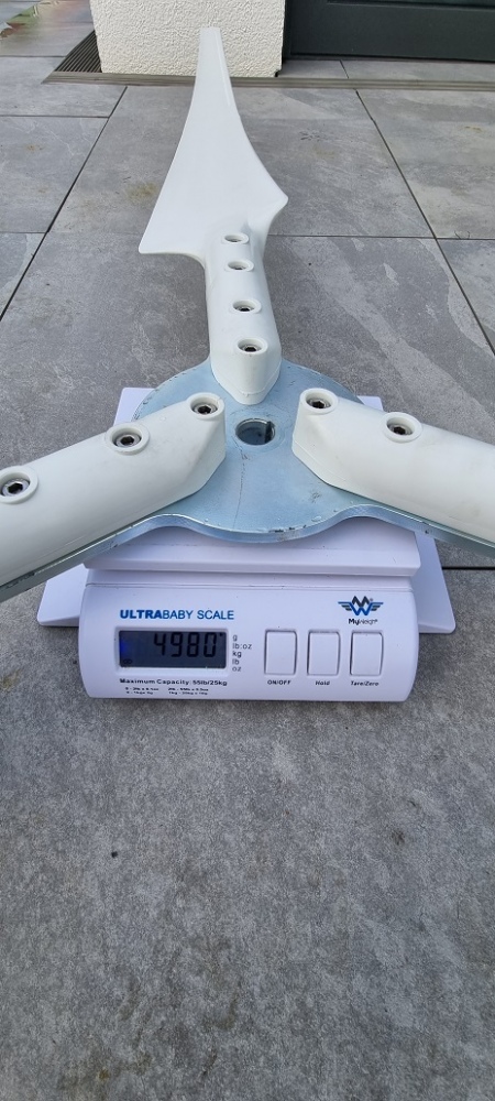 Ich denke irgendwas stimmt mit der Waage nicht! Ein Blatt wiegt rund 650g, dann noch die Aufnahme mit 2x zusätzlich Metall. Hier sollten mindestens +1,5kg raus kommen?! Und gerade bei @dognose seinem freien Feld sollten 3 Blätter die erste Wahl sein. Ich glaube groß Anlaufprobleme (wie bei mir in der Stadt) sollte er auch nicht haben. Und ob er dann untenrum die 30W mehr durch früheren Anlauf mitnehmen kann, glaube ich auch nicht, so lang der WR erst mit 45V Startspannung läuft. Er brauch Drehzahl. Und die geht mit 3 Blättern besser.