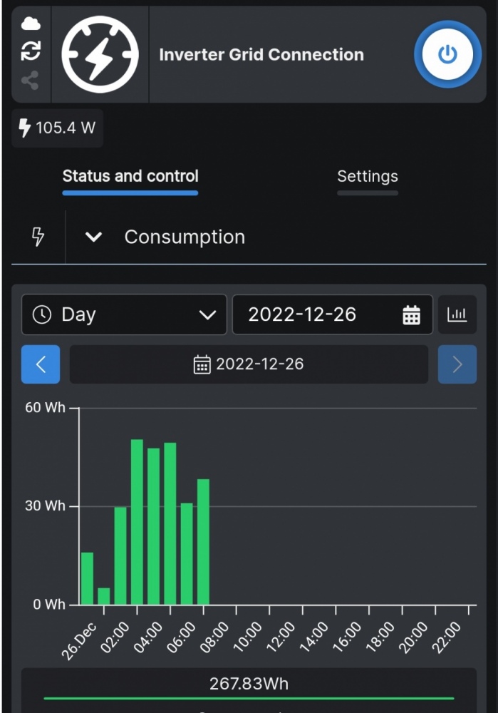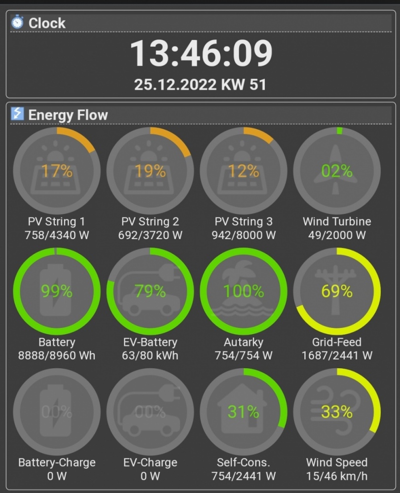 Unterm Strich hat das Shelly für die Nacht 30 - 50 Wh gezählt. Für den geringen Wind und die vorläufige Höhe von 4,8m finde ich das i.O. Natürlich lädt man damit keine Batterie oder kein E-Auto - aber das ist doch schon 10% meines nächtlichen Bedarfs, den die PV-Batterie dann weniger liefern muss.