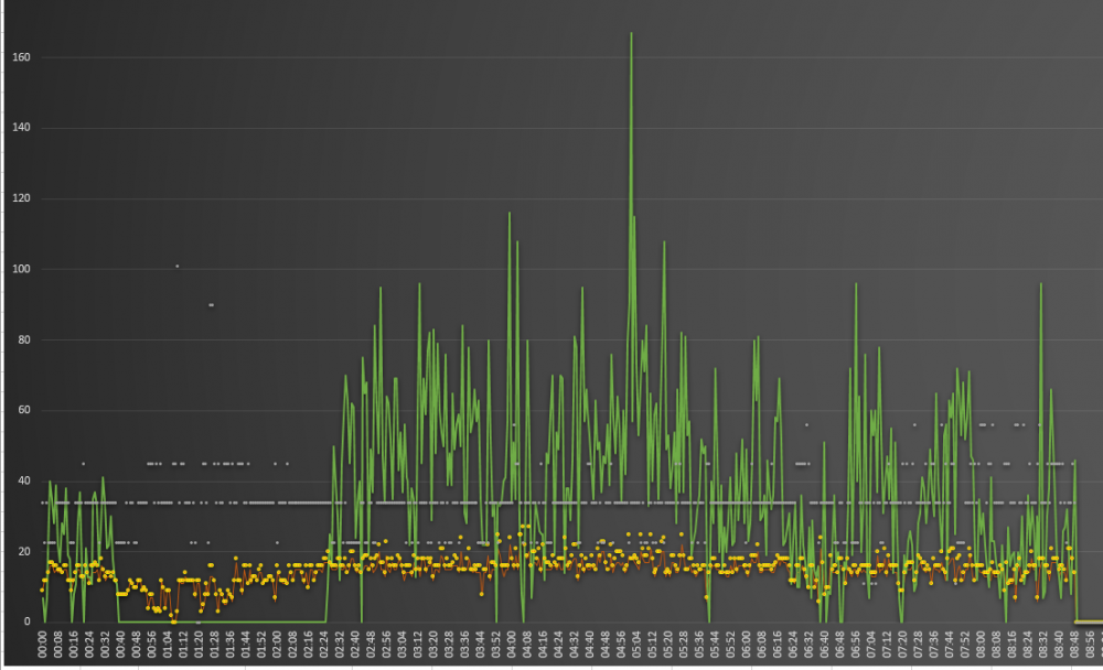 Sekunden-Peaks bis 250 Watt hab ich bereits gesehen, aber für die statistische Beobachtung ist das recht uninteressant, da ist der Graph (bei minütlichem Auswerten) mehr oder weniger Roulette, ob man jetzt 15 oder 300 Watt erwischt, das macht keinen Sinn.