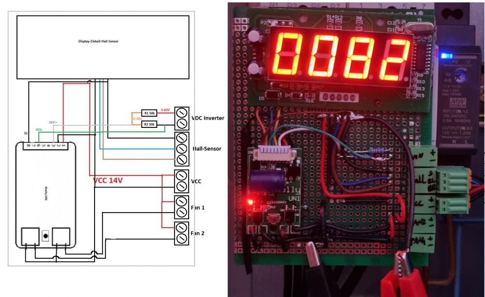 Die VDC-Überwachung des Inverters war ein wenig trickreicher: Das Shelly unterstützt über den ADC-Input nur Spannungen bis 30V. Daher habe ich (siehe Schema unten) einen Spannungsteiler aus 2* 50kOhm Widerständen eingebaut, und messe mit dem Shelly zwischen den Widerständen - in diesem Fall muss ich dann die gemessene Spannung mal 2 nehmen. (da beide Widerstände gleich sind)
